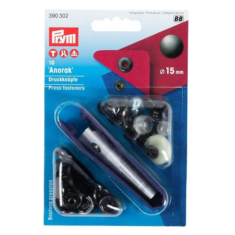 Blíster de 10 broches anorak Prym pavonados de 15 mm. Corchetes resistentes para ropa, accesorios y manualidades, fáciles de colocar con martillo o tenazas.