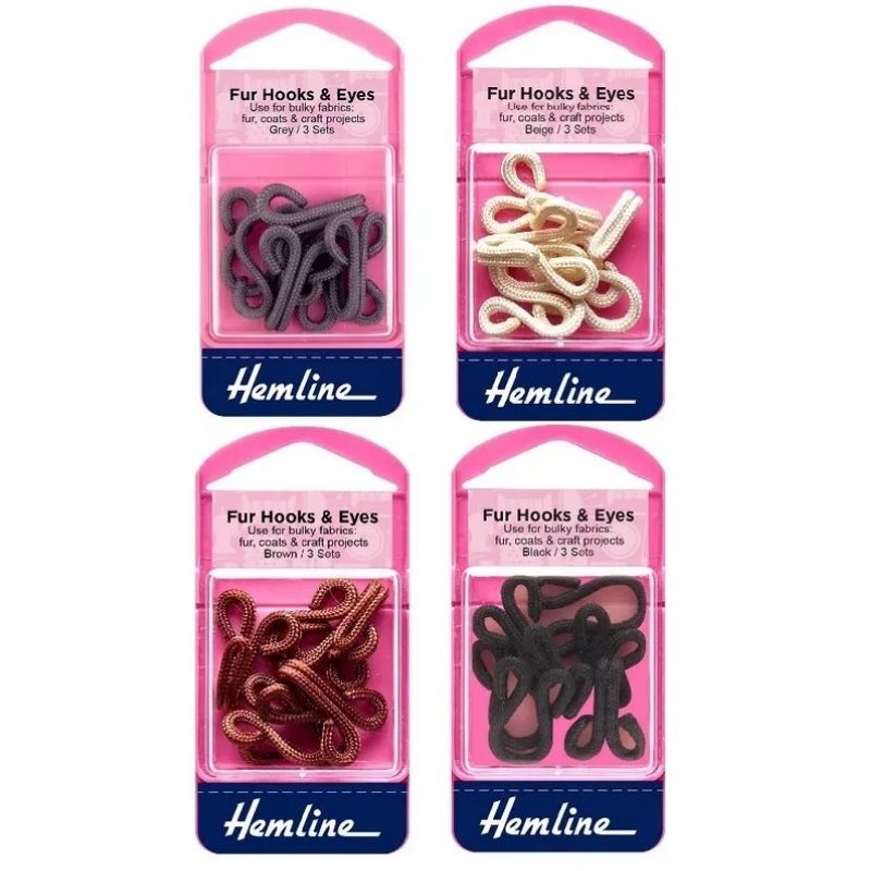 Corchetes forrados Hemline de 40 mm, ideales para peletería y prendas de abrigo. Disponibles en gris, marrón, beige y negro. Blíster con 3 juegos completos.