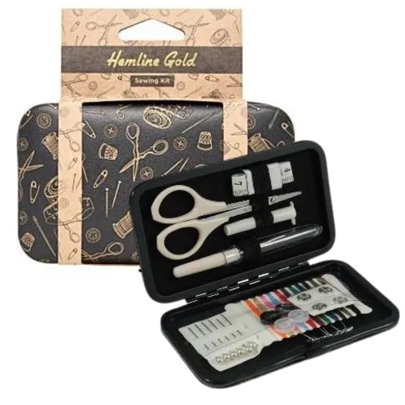 Elegante costurero de viaje Hemline Gold, con funda de piel sintética y completo set de accesorios de costura. Ideal para llevar en el bolso o tener siempre a mano.