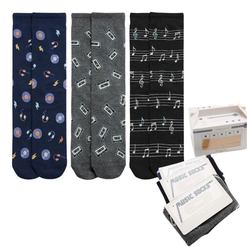 Pack de 3 calcetines altos para hombre con estampados musicales, puño antipresión y caja regalo en diseño cassette.