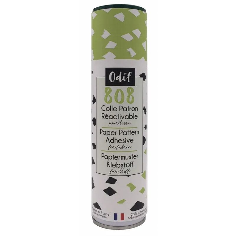 Spray Odif 808 reactivable para patrones de costura y patchwork. Adhiere papel a tela de forma temporal y reutilizable. Envase de 250 ml.
