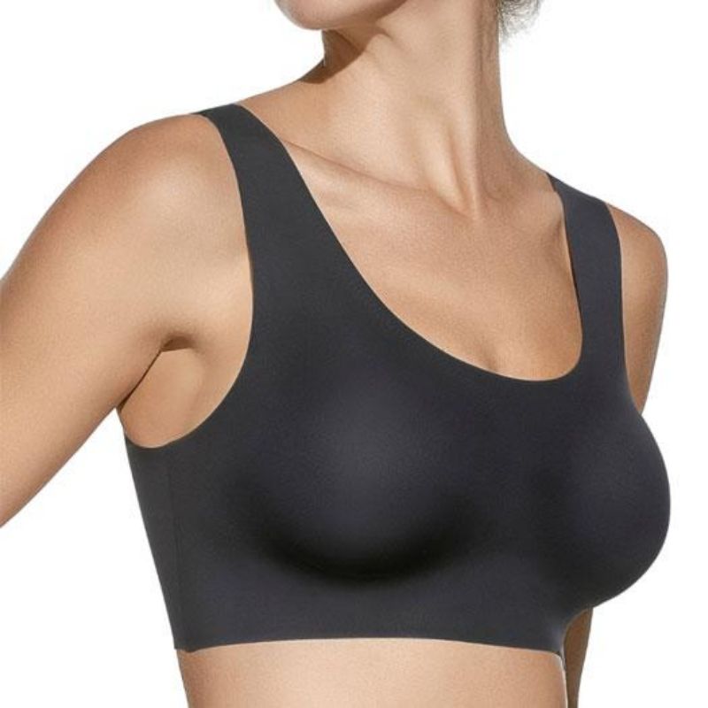 Sujetador sin costuras de corte láser termofijado con copa de relleno extraíble. Máxima comodidad, ajuste perfecto e invisible bajo la ropa. Disponible en negro y tierra. Tallas S y M.